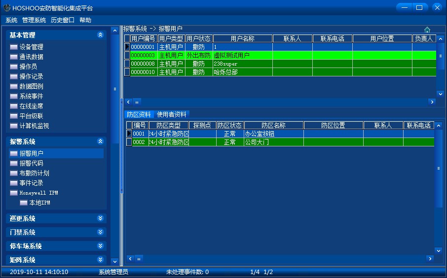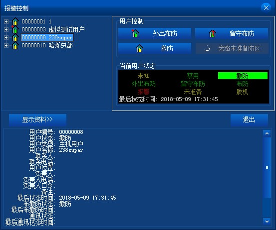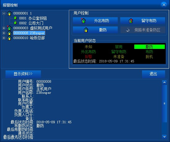 下部為詳細(xì)資料顯示區(qū),用戶樹中,選擇用戶,顯示該用戶的詳細(xì)資料;選擇防區(qū),顯示該防區(qū)的詳細(xì)資料。
