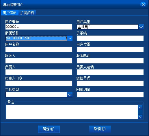 可錄入報警用戶的聯(lián)系信息和主機(jī)類型及用戶備注。