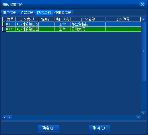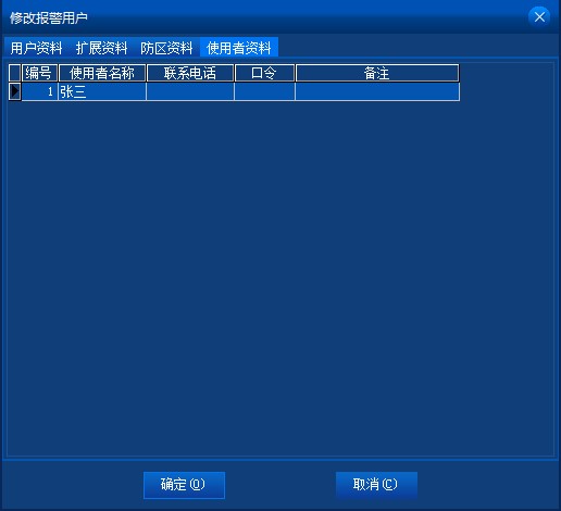 當(dāng)修改報警用戶時,還會有防區(qū)資料和使用者資料錄入。