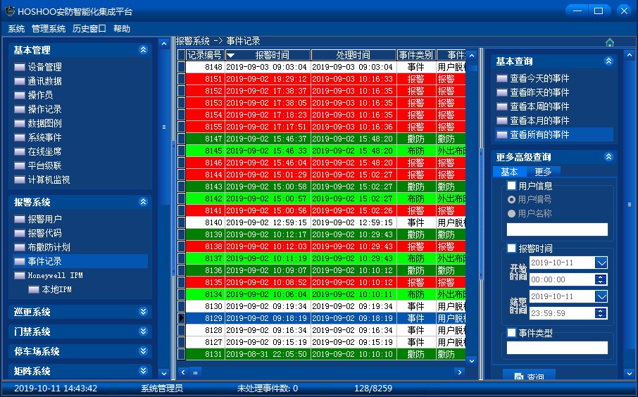 在平臺軟件中操作面板里的報警系統(tǒng)面板組上,點擊【事件記錄】,功能區(qū)將顯示報警事件記錄數(shù)據(jù)網(wǎng)格,如下圖: